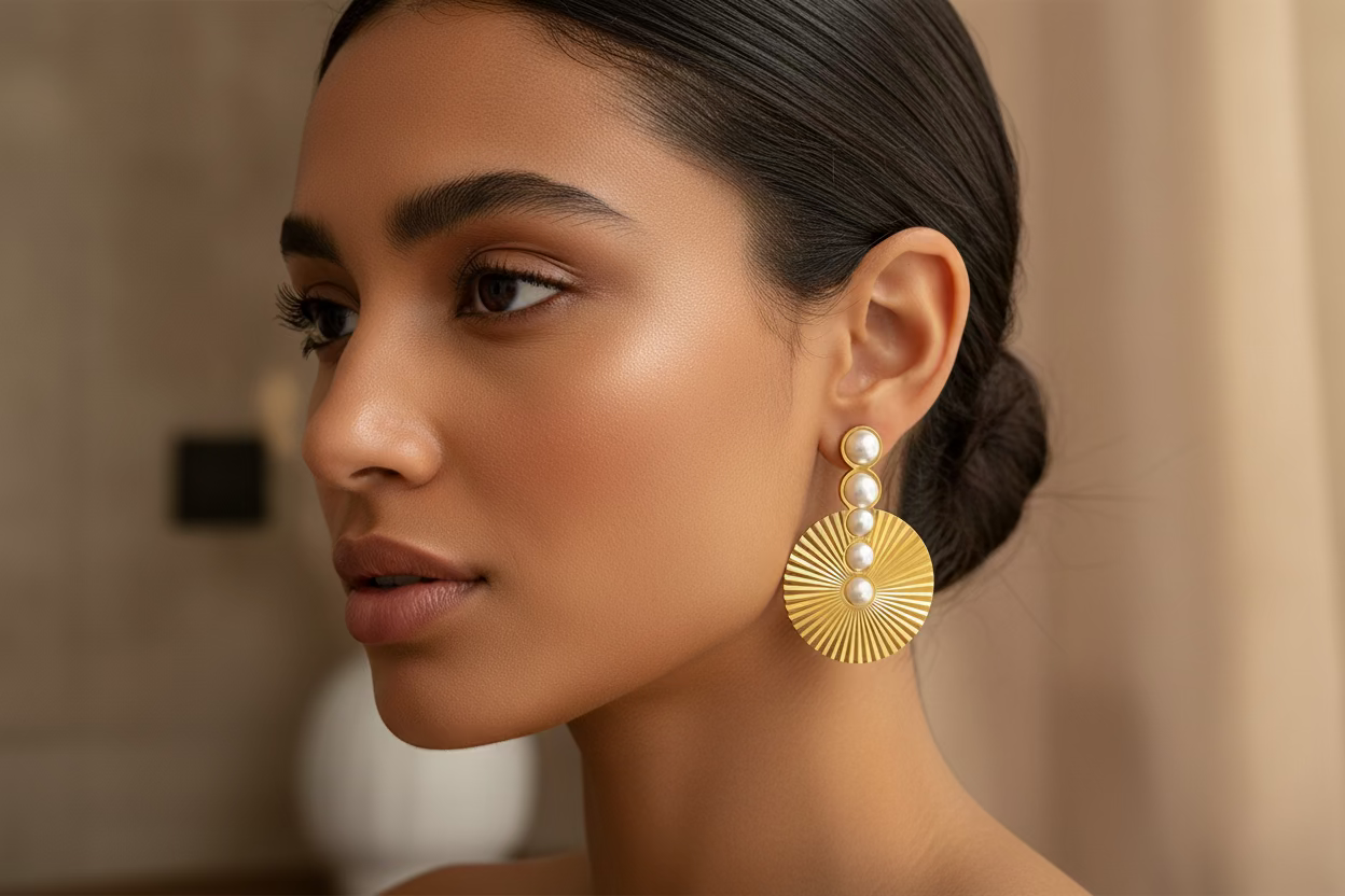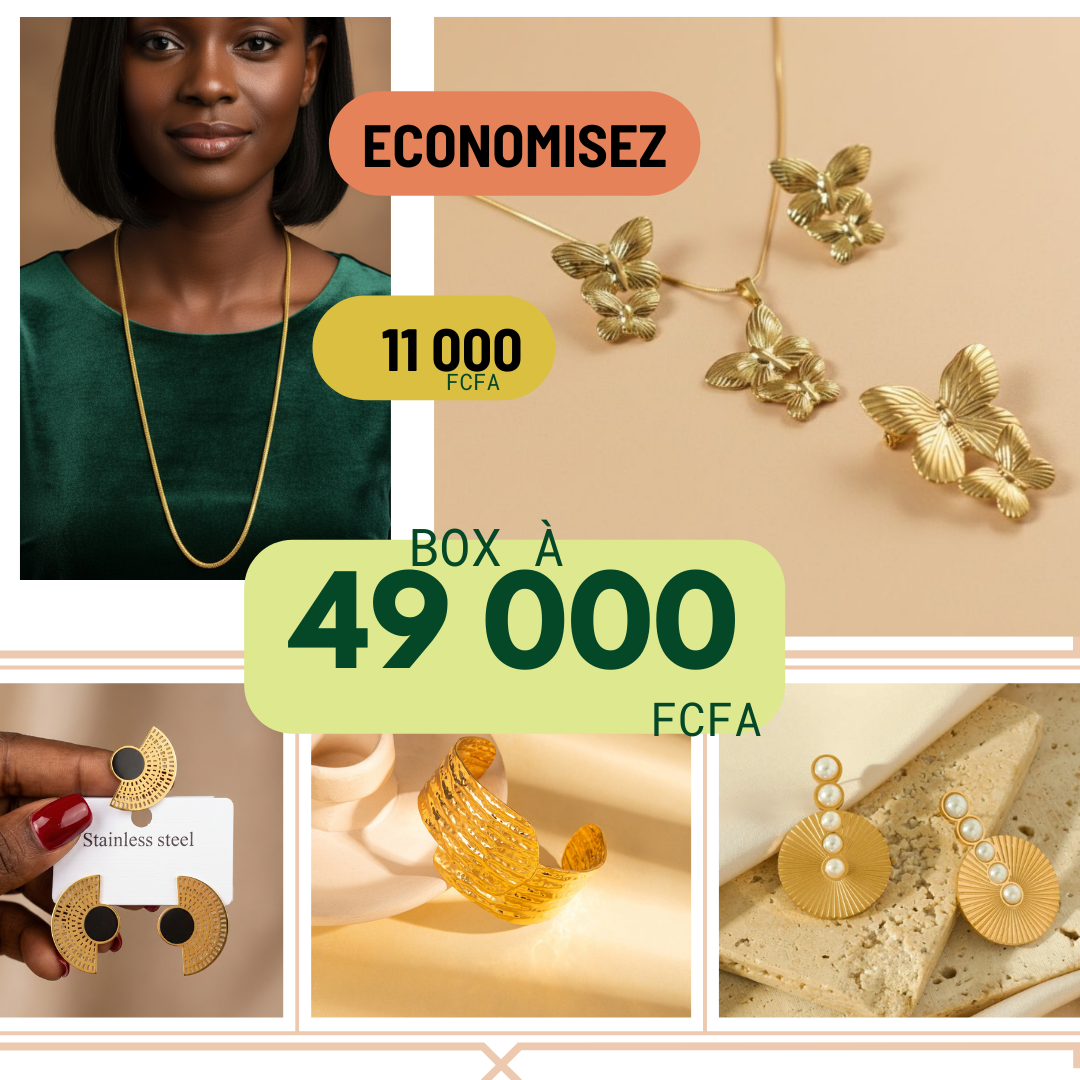 La box comprend : Collier Long Ayda + Ensemble Maty + Ensemble Vero + Bracelet Onde dorée + Boucles d'oreilles avec perles blanches.