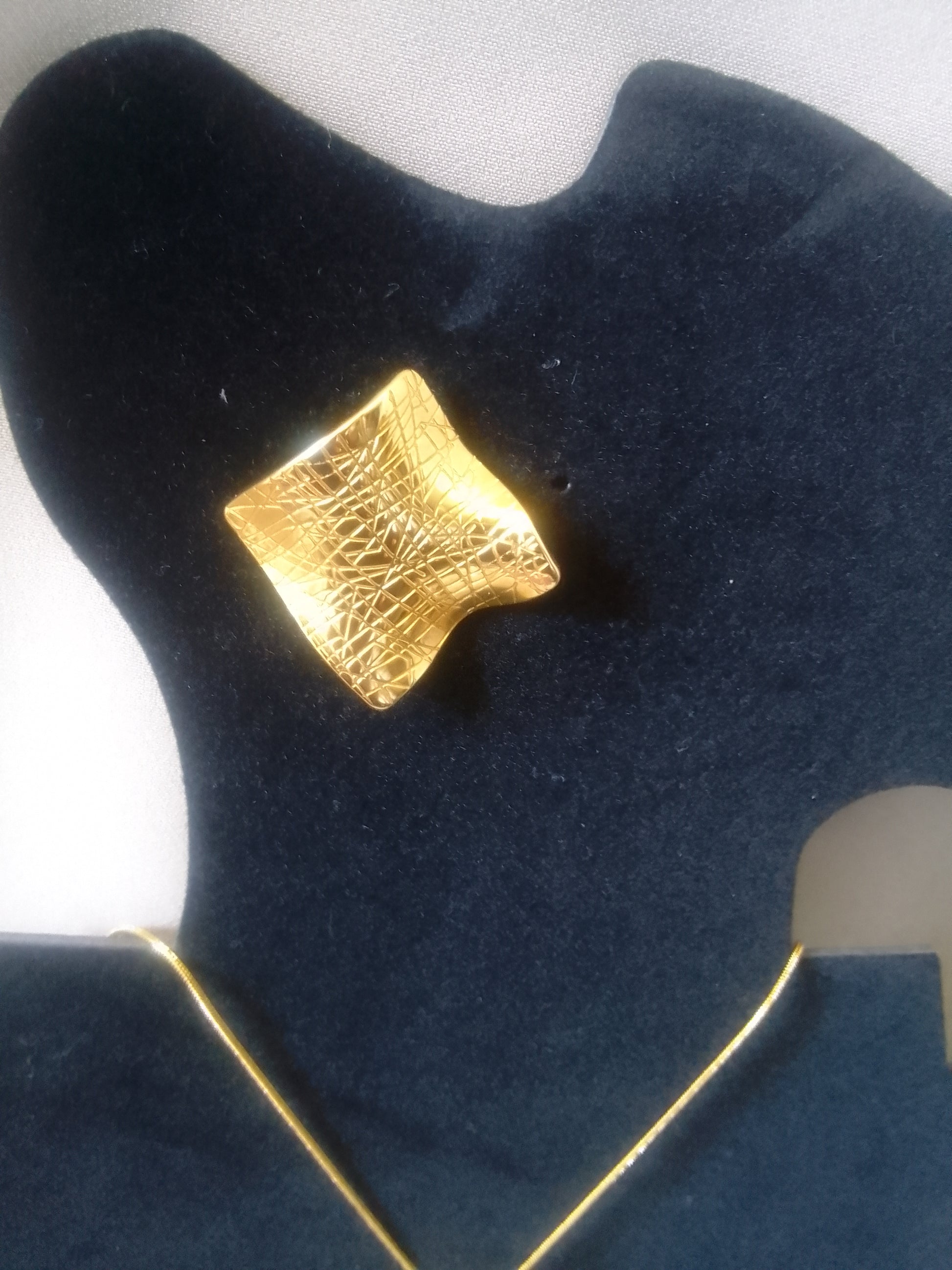 Fabriqué en acier inoxydable et recouvert d'or 18k, cet ensemble élégant se distingue par son design en forme de vague, apportant une touche de fluidité et de sophistication à votre look. Le métal martelé capte la lumière de manière unique, ajoutant une brillance subtile au bijou.